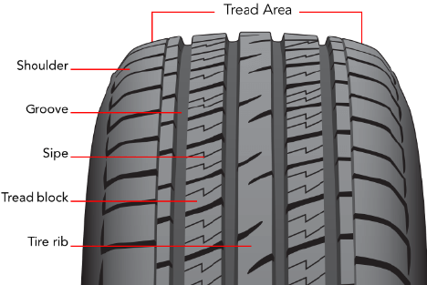 Tread area (contact patch) – The part of the tire that comes into contact with the road. The type of tread is distinguished by the design of its ribs and grooves.